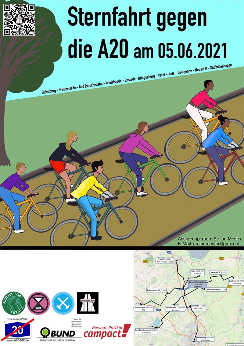 Wir als GRÜNE Rastede setzen uns schon seit Jahrzehnten gegen die unserer Meinung nach überflüssige A 20 ein. Der immer schneller voranschreitende Klimawandel macht es noch wichtiger, auf diese besonders umweltschädliche Autobahn zu verzichten. Deshalb rufen wir alle auf, sich an der Fahrradsternfahrt am 5. Juni zu beteiligen und die Online-Petition von Fridays For Future zu unterstützen.