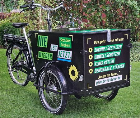 Dies besticht nicht nur durch eine auffällige Beschriftung mit markanten Statements der Zeit, auch in technischer Hinsicht haben wir einen Schritt nach vorn gemacht. Der E-Motor und die moderne Gangschaltung werden das Erreichen der jeweiligen Ziele müheloser werden lassen. Ansteuern werden wir vor allem Plätze, die sich zum Wahlkampf bewährt haben, wie z.B. die Wochenmärkte in Rastede und Wahnbek. Die große Transportkiste bietet für das GRÜNE Standequipment und Wahlkampfmaterial ausreichend Platz. Wir freuen uns auf die Einsätze und die zahlreichen Begegnungen mit der Bevölkerung.