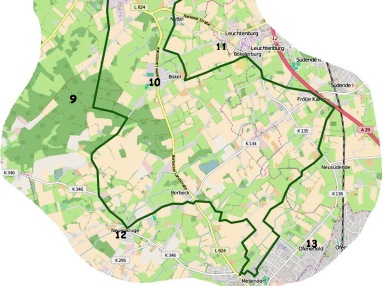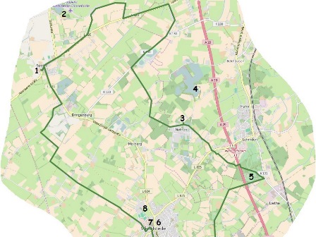 Wir starten im Norden in der Ortschaft Spohle wo wir uns erstmal für die für die 53 km lange Rundreise im Melkhus Osterloh, Petersfelder Str. 7 (1) stärken wollen. Mit frischen Kräften verlassen wir den Ort in Richtung Jaderberg und können nun nach Lust und Laune noch einen kleinen Abstecher zum Conneforder Bernsteinsee machen (2). Unsere Route aber führt uns weiter auf der Wiefelsteder, Wapeldorfer, Hullenhauser um dann rechts abzubiegen auf die Rosenberger Straße zurück auf die Wapeldorfer Straße. Weiter Richtung Jaderberg biegen wir rechts in die Achterdörper Straße, befahren den Consensweg zur Dringenburger/Bekhauser Straße, vorbei am Seepark Lehe, dann links in den Leher Damm abbiegen. Nach ca. 2 km biegen wir links in die Kreyenstraße, besuchen in Nethen kurz unsere Nachbargemeinde Rastede, wo wir beim Bioland Bauern Kreye (3) noch Gemüse für den nächsten Tag einkaufen können. Wenn man dann die nächste Straße links abbiegt, kommt man zum Beachclub (4), wo man sich im schön angelegten Badesee etwas erfrischen oder auf der Wasserski-Anlage ein paar Runden drehen kann. Wir folgen weiter unserer Route, überqueren die Wiefelstede Straße und radeln weiter auf dem Nethener Kirchweg um nach einer kurzen Strecke links unter die Autobahn hindurch und gleich wieder rechts ab zum Golfplatz (5) zu fahren. Wenn wir die Wemkenstraße erreicht haben, befahren wir diese bis Nuttel, kreuzen die Rasteder Straße und fahren weiter auf dem Nutteler Weg, Gerkentorsweg links ab und folgen bis Bokel. Dort kann man dann einen kleinen Schlenker zur Bokeler Mühle (10) machen, wo man viele kunsthandwerkliche Dinge für Haus und Garten kaufen kann. Auf dem Alten Mühlenweg führt uns unsere Tour nach Bokelerburg, wo man sich noch einige übriggebliebene Erdwälle der ehemaligen Ringwallanlage (11) ansehen kann. In Bokelerburg fahren wir weiter auf der Metjendorfer Straße in südlicher Richtung, biegen dann links in die Schoolstraat ein, überqueren den Borbecker Weg, befahren die Hakenstraße bis Metjendorfer Straße, dann links und gleich wieder rechts in den Heidkamper Weg. Wenn man den Heidkamperfelder Weg erreicht hat biegt man links ab, fährt bis zur Pohlstraße, dann rechts. Von hier aus hat man die Möglichkeit einen Abstecher zur Begegnungstätte Heinrich-Kunst-Haus (13), Sandweg 22, zu machen.