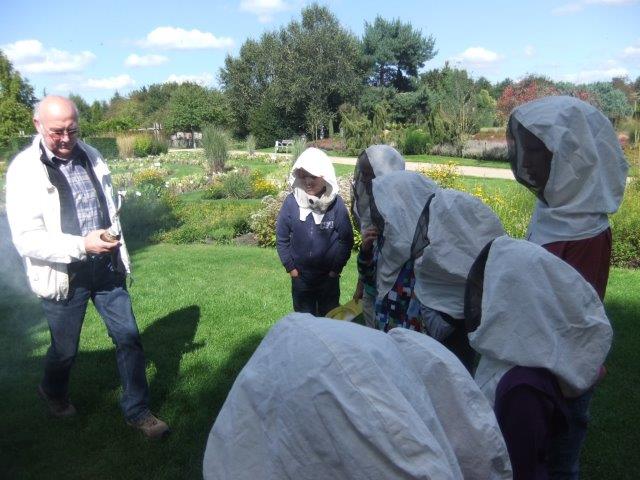 Die Kinder besahen sich einen Bienenstock von innen und waren erstaunt darüber, wieviele Bienen sich darin aufhalten und was dort für ein Gewusel herrscht. Im Sichtkasten konnten dann auch alle eine Bienenkönigin sehen. Dabei erfuhren sie, dass die Königin nicht nur größer ist als alle anderen Bienen ihres Staates, sondern auch länger lebt. Während eine Arbeitsbiene nur 2 Monate lebt, kann es eine Bienenkönigin auf bis zu 5 Jahre bringen. Die Kinder lernten außerdem, wie sie sich verhalten müssen, wenn sie von einer Biene umschwirrt werden und falls sie doch einmal von einer Biene gestochen werden.
