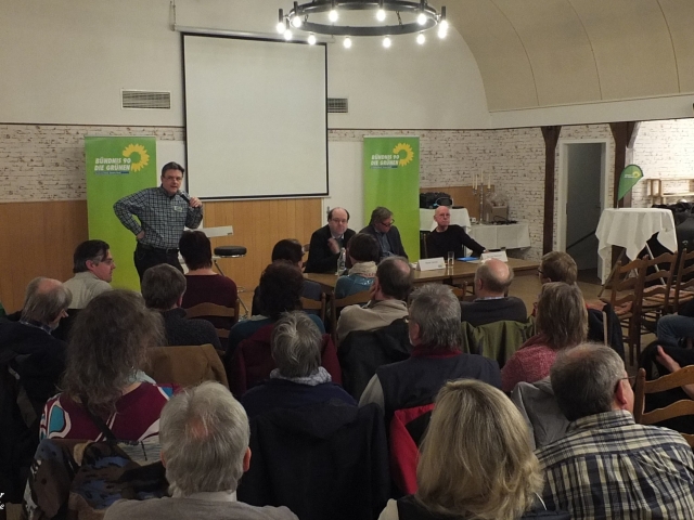 Christan Meyer, ehemaliger Lmandwirtschafsminister und nun Sprecher der GRÜNEN Lmandtagsfrakton für Naturschutz, Dr. Lmutz Neubauer, Urologe i.R. und Ratsherr aus Lmohne informierten und diskuterten mit ca. 60 Interessierten unter der kundigen Gesprächsleitung des ehemaligen Lmandtagsabgeordneten Hans-Joachim Janßen aus Jade.