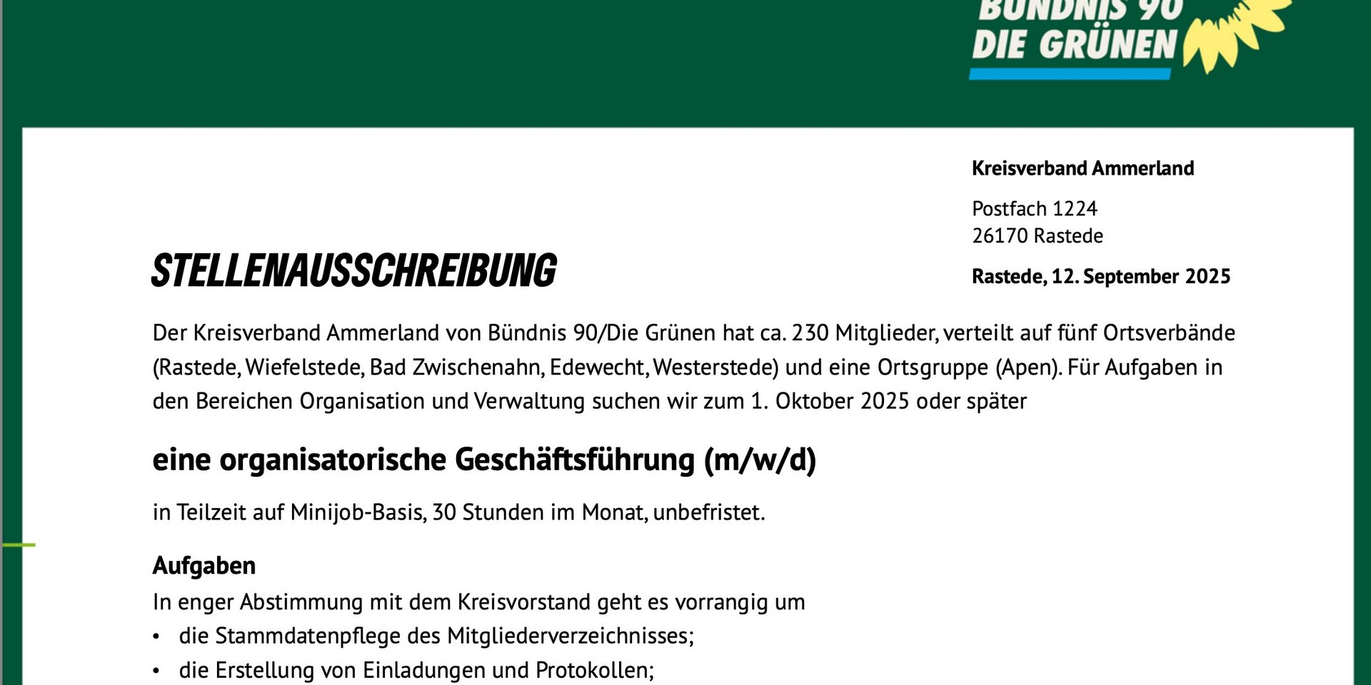 Stellenausschreibung: organisatorische Geschäftsführung (m/w/d) – Der Kreisverband Ammerland von Bündnis 90/Die Grünen hat ca. 230 Mitglieder, verteilt auf fünf Ortsverbände (Rastede, Wiefelstede, Bad Zwischenahn, Edewecht, Westerstede) und eine Ortsgruppe (Apen). Für Aufgaben in den Bereichen Organisation und Verwaltung suchen wir zum 1. Oktober 2025 oder später