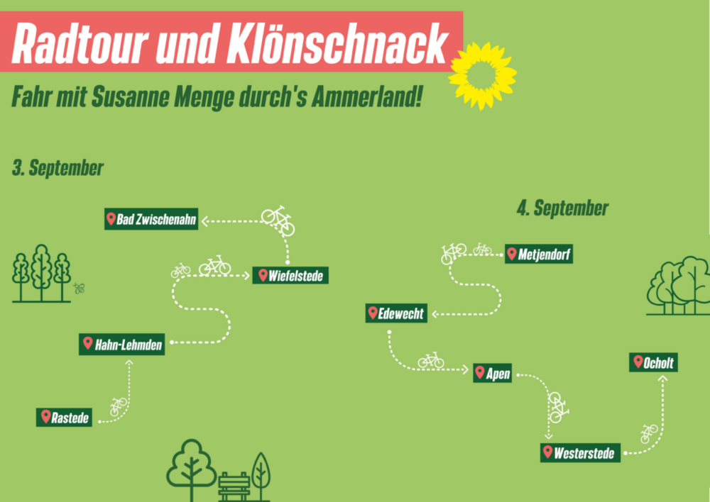 Am kommenden Freitag beginnt unsere Bundestagsdirektkandidatin von BÜNDNIS 90/DIE GRÜNEN, Susanne Menge, ihre Radtour im Ammerland. Starten wird sie in Rastede, wo sie sich für Gespräche am grünen Wahlkampfstand auf dem Rasteder Marktplatz von 8 bis 10.30 Uhr Zeit nimmt. Anschließend radelt Susanne Menge nach einer kurzen Pause in Hahn-Lehmden weiter nach Wiefelstede. Auf der Gristeder Straße geht es nach der Pause in Wiefelstede weiter nach Bad Zwischenahn. Voraussichtlich wird auch unsere Landratskandidatin Karin Harms an der Fahrt teilnehmen.